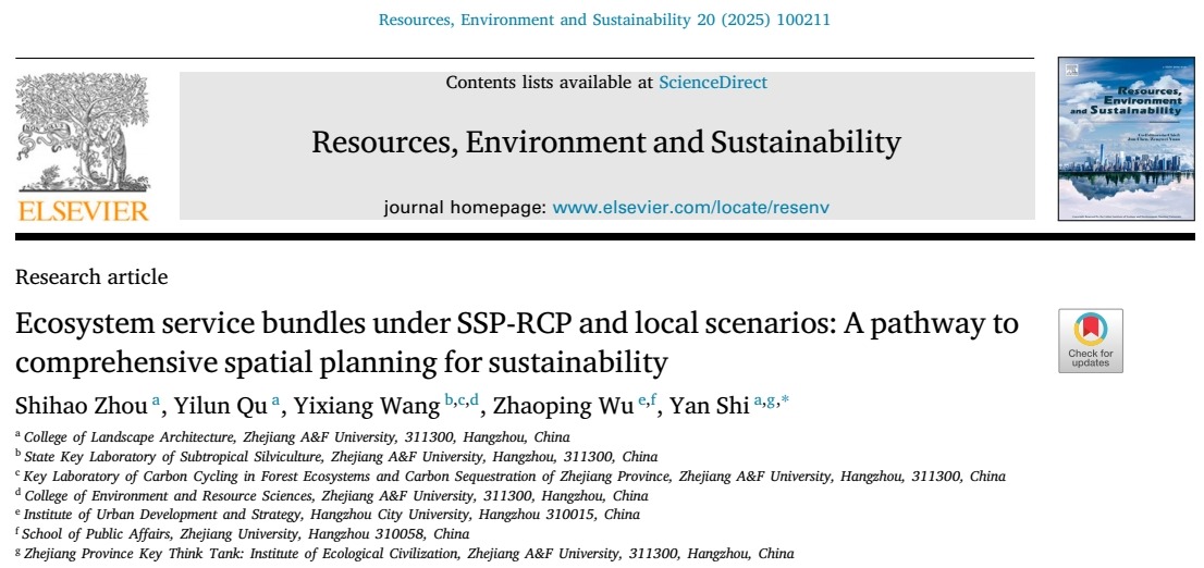 近日,风景园林与建筑学院硕士研究生周世豪第一作者的文章《Ecosystem service bundles under SSP-RCP and local scenarios: A pathway to comprehensive spatial planning for sustainability》(《SSP-RCP和地方情景下的生态系统服务簇研究:迈向可持续综合空间规划的路径》)发表在《Resources, Environment and Sustainability》。该期刊为中科院环境科学与生态学1区TOP期刊,JCRQ1区,影响因子为12.4。风景园林专业硕士生导师史琰副教授为通讯作者。