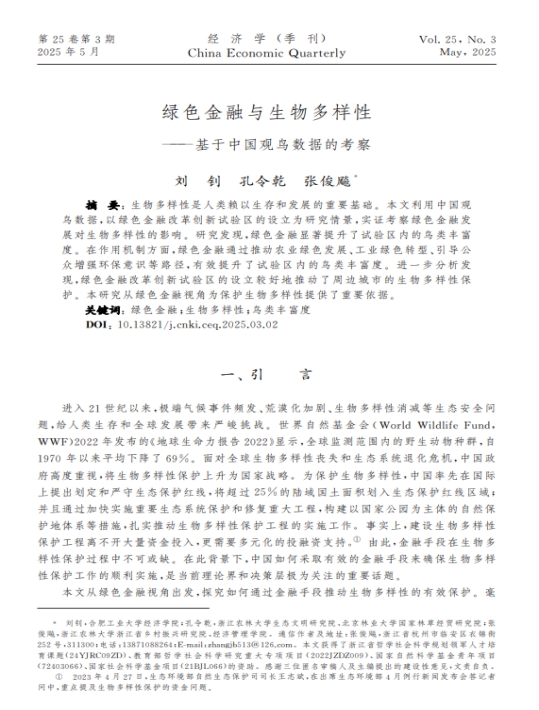 近日,经济管理学院张俊飚教授团队的论文《绿色金融与生物多样性—基于中国观鸟数据的考察》在《经济学(季刊)》2025年第3期上发表。该论文第一作者为合肥工业大学的刘钊博士,第二作者为BEAT365的孔令乾副教授,张俊飚教授为通讯作者。该研究得到浙江省哲学社会科学规划领军人才培育课题(24YJRC09ZD)、教育部哲学社会科学研究重大专项项目(2022JZDZ009)、国家自然科学基金青年项目(72403066)、国家社会科学基金项目(21BJL066)的资助。