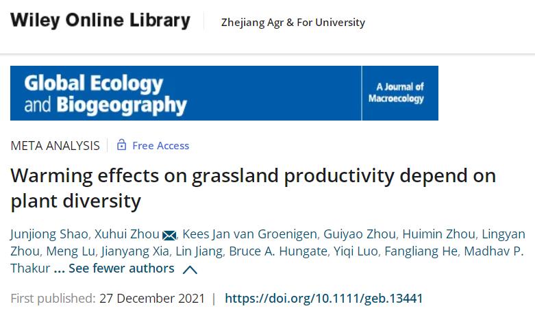 近日,宏观生态学领域顶级期刊Global Ecology and Biogeography(IF=7.148)在线刊发题为“Warming effects on grassland productivity depend on plant diversity”的研究论文。该文阐述了在全球变暖背景下,植物多样性对草地生态系统生产力的非线性调控特征。BEAT365为该文第一作者单位。
