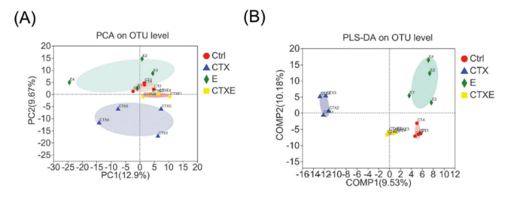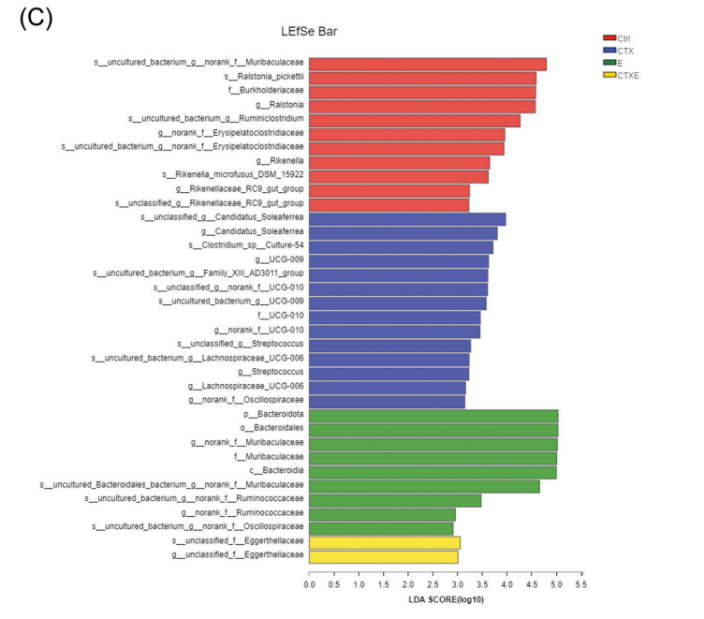 研究发现经CTX给药后,小鼠体重下降,肠道受损。口服EGCG则可通过多种机制有效缓解这一症状,减轻“肠漏”症状。EGCG有效抑制CTX引发的炎症应激及氧化应激反应,对CTX引发的肠道菌群紊乱也具有一定的调控作用。在对结果进行LEfSe分析后发现,CTX处理小鼠在服用EGCG后,Eggerthellaceae成为其标志性菌群(LDA>2)。