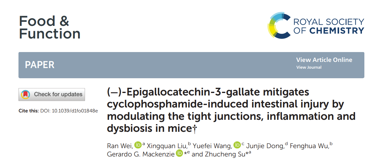 近日,茶学团队教师魏然博士在国际知名学术期刊Food & Function (IF=5.396,一区TOP) 发表了题为"(−)-Epigallocatechin-3-gallate mitigates cyclophosphamide-induced intestinal injury by modulating the tight junctions, inflammation and dysbiosis in mice"的研究论文。研究揭示了茶(Camellia sinensis)活性组分表没食子儿茶素没食子酸酯(epigallocatechin-3-gallate, EGCG)可有效改善由化疗药物环磷酰胺(cyclophosphamide, CTX)引发的肠道毒性,为将茶天然产物进一步应用于人体保健提供了重要的理论依据。