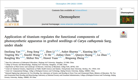 近日,国家重点实验室林木栽培生理研究团队在国际知名期刊《Chemosphere》(IF=7.086)发表了题为“Application of titanium regulates the functional components of photosynthetic apparatus in grafted seedlings ofCarya cathayensis Sarg. under shade”的研究论文。该研究在光合作用层面解析了山核桃响应遮荫胁迫的生理机制以及抗水解稳定离子钛缓解胁迫的生理机制,为促进山核桃在遮荫条件下的生长奠定了理论基础。