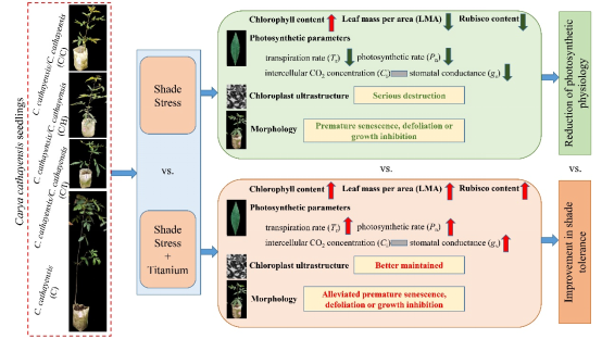 光照是植物生长发育过程中的重要环境因子,光照不足会对植物生长发育产生负面影响。含钛化合物由于其在抵抗逆境胁迫中的作用而在植物生物学研究领域备受关注。山核桃是浙皖山区的重要干果树种,快速生长期内的连续阴雨天气对其生长发育产生了不利影响。揭示山核桃响应遮荫胁迫的光合生理机制、探索提升其抵抗遮荫胁迫能力的措施,对于促进山核桃在遮荫条件下的正常生长发育具有重要意义。