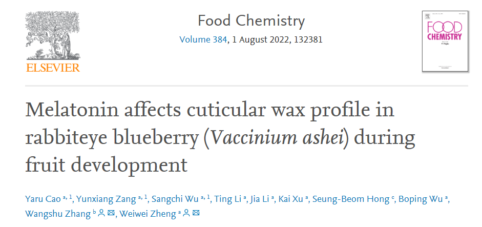近日,园艺学院2019级硕士研究生曹亚茹和2019级园艺专业本科生吴桑池在果树栽培生理与种质创新团队郑伟尉副教授的指导下,共同在国际知名期刊Food Chemistry(影响因子7.514/中科院一区Top)上发表了题为“Melatonin affects cuticular wax profile in rabbiteye blueberry (Vaccinium ashei) during fruit development”的研究论文。该研究为褪黑素调控兔眼蓝莓果实发育过程中表皮蜡质代谢分子机理研究奠定了坚实基础。