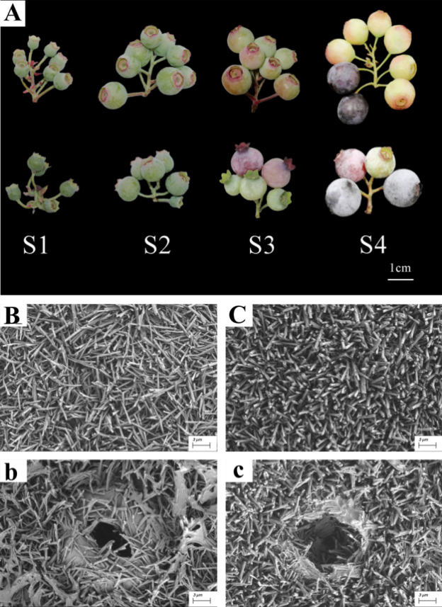 本研究以十年生兔眼蓝莓‘巴尔德温’、‘灿烂’为材料,在转色期进行褪黑素处理,采用气相色谱-质谱联用技术(GC-MS)测定兔眼蓝莓表皮蜡质的组分和含量,探究褪黑素对蓝莓果实发育期蜡质和果实品质的影响。研究结果发现两个品种均存在不同期成熟现象。通过扫描电镜观察发现蓝莓果皮蜡质呈白色杆状,气孔被蜡质填充,两个品种无明显差异(图1)。