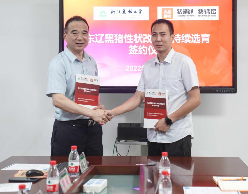 会上,绍兴天圣牧业有限公司与动科动医学院签订了东辽黑猪性状改良与持续选育的技术服务协议,该项目旨在深入研究东辽黑猪的优质基因育种、优良种群保种等关键技术领域,以进一步培育扩繁优质纯种东辽黑猪并推动产业化应用。绍兴天圣牧业公司计划出资150万元投入该项目研究。双方表示,将进一步发挥资源优势,共享平台和技术,制订和实施核心种群选育计划,把东辽黑猪选育成更优质的种猪,为老百姓提供品质更好、营养更佳的猪肉。