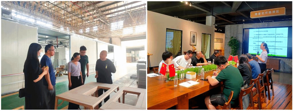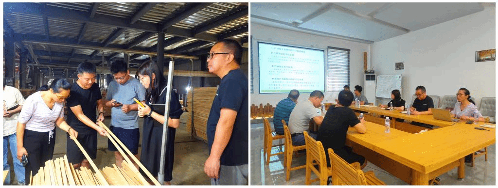 在福建省建瓯市,南平市科技局科技特派员工作办公室主任吴水旺和建瓯市发展改革和科技局副局长陈族钦带领服务团走进福建大庄竹业科技有限公司。作为福建省科技特派员,孙芳利教授与大庄公司在户外竹集成材的保护和应用中已进行了长期的合作。公司负责人带领大家参观了原竹加工车间、户外竹地板生产线以及竹材药剂处理车间。在座谈交流会上,企业交流了企业发展历程和经营现状,感谢科技特派员为企业做出的重要贡献。服务团老师对企业生产中遇到的问题进行了分析和解答,双方在人才培养、项目申报和技术攻关等方面进行了深入交流。