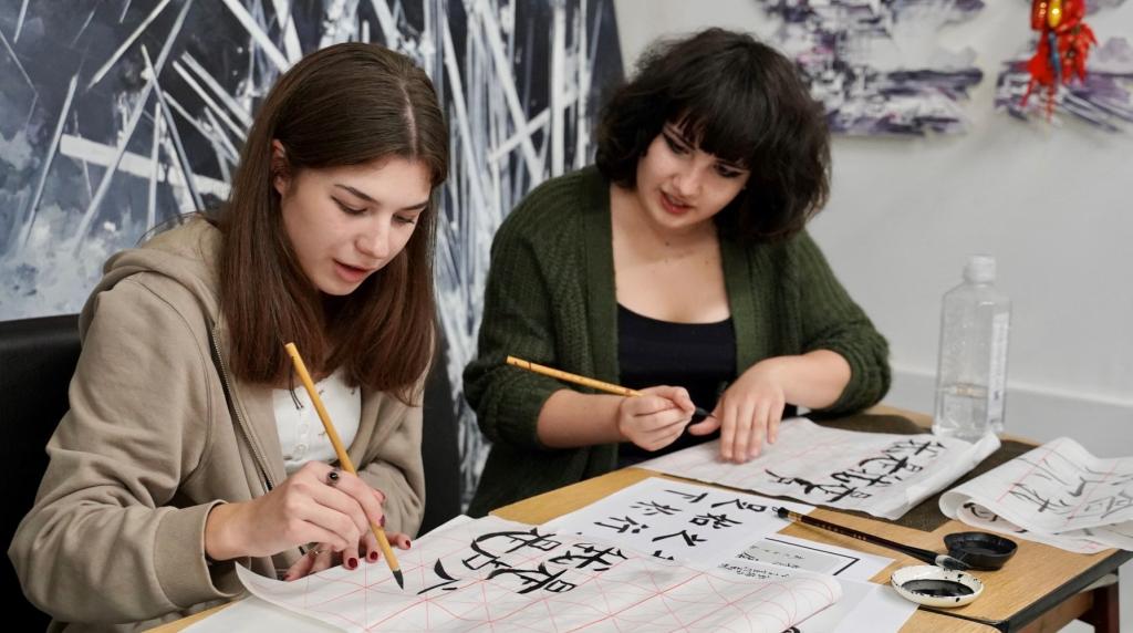 在诵读《论语》板块,学生们有的身着汉服,有的手持纸稿,伴随着阵阵掌声,在本土汉语老师历碧彩•库达诺芙(Ljubica Cudanov)和玛丽安娜•马尔科维奇(Marijana Markovic)的指导下,重现昔日孔子“杏坛”开课的景象。扮演孔子的学生安德烈·尼科维奇(Andrej Niković)表示,即使在两千多年后的今天,孔子“见贤思齐”、“三省吾身”等思想依然没有过时。茶艺板块,孔院老师向学生展示了选茗、择水、选择茶具等一系列茶艺内容,渲染茶和茶人清纯、幽雅、质朴的气质,艺术感染力很强。在表演完成以后,教室里爆发出阵阵赞叹和热烈掌声。学生叶莲娜·佳露尼娅(Jelena Galonja)禁不住感叹道,在欣赏老师泡茶的过程中屏息静气,生怕打扰这幽雅的氛围。书法板块,现场学生将平时所学进行展示,个个迫不及待地手执毛笔、书写自己的汉语名字,有的一笔一画、端端正正,有的别出心裁、创新字体,收获感满满。