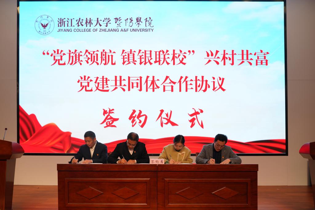 11月17日,经济管理学院党委与暨阳学院党委、诸暨市应店街镇党委、中国银行诸暨支行党总支联合举办了“党旗领航 政银联校”乡村共富党建共同体签约仪式。