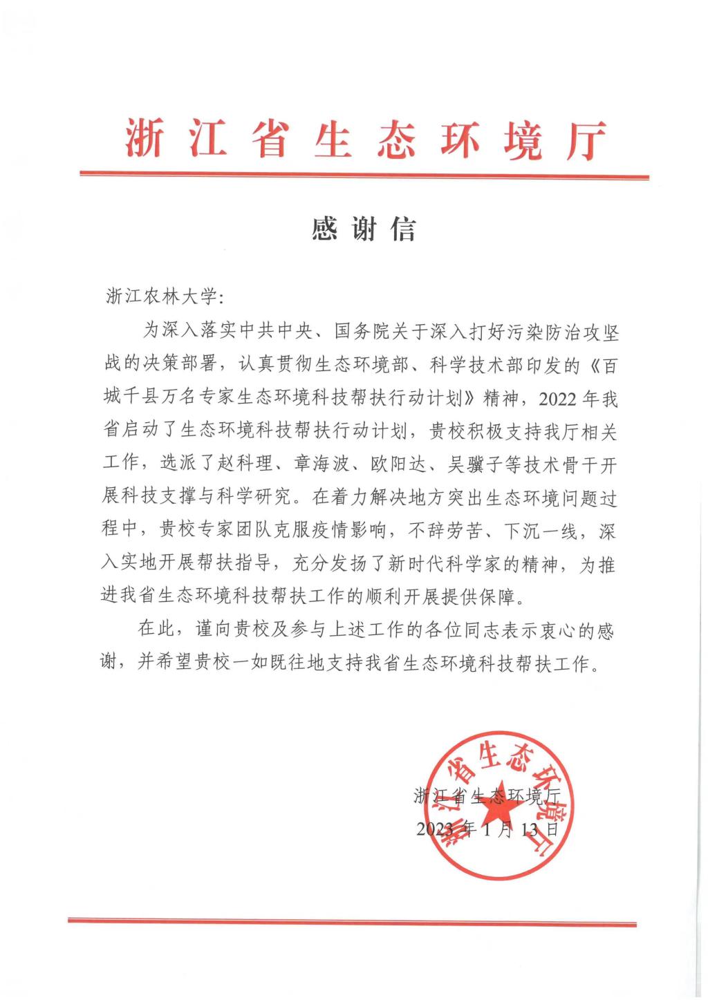 近日,浙江省生态环境厅向BEAT365发来感谢信,向BEAT365英国官网支持生态环境科技帮扶工作表示衷心感谢。