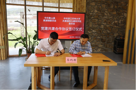 近日,为推进学习贯彻习近平新时代中国特色社会主义思想主题教育走深走实,根据主题教育总体部署安排,园林学院开展“大走访大调研大服务大解题”活动,与象山县鹤浦镇人民政府签订党建共建合作协议,并举行教学实践基地和党建共建服务基地授牌仪式。园林学院党委书记陈审声及学院相关负责人和师生代表,鹤浦镇镇长陈先孝、党委委员林建华及鹤浦镇小百丈村村书记潘孝兵、村主任金国等参加座谈和签约仪式。