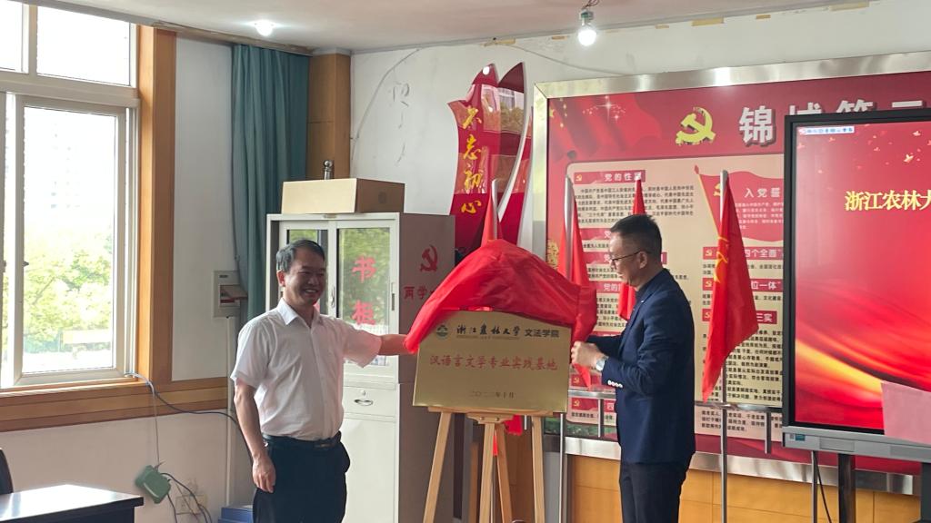 10月19日上午,文法学院与临安区锦城第二初级中学(以下简称“锦城二中”)签署共建汉语言文学专业实践教学基地协议,并举行揭牌仪式。文法学院党委书记朱红东及学院、中国语言文学学科、汉语言文学专业相关负责人,锦城二中校长凌平、副校长厉仁华、教务主任、各年级语文组备课组长等参加了签约及揭牌仪式。