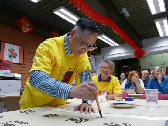 孙一鸣代表海天集团向诺大孔院捐赠了书法用品和文化用品,介绍了海天集团的基础业务和现有规模。洪君佩现场展示了书法,引来学生围观欣赏。
