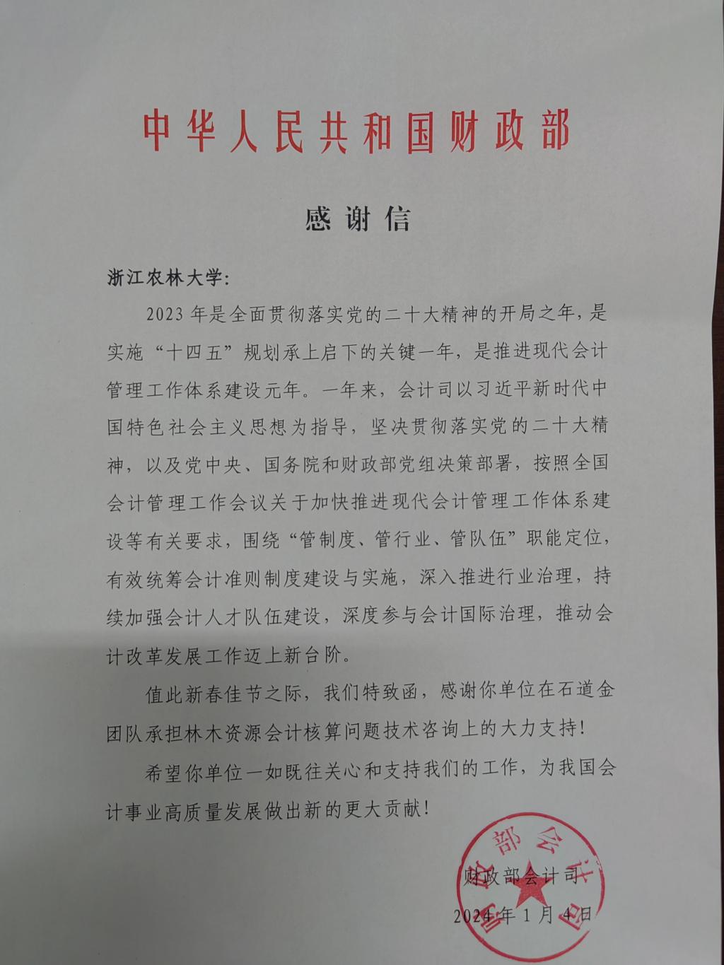 日前,财政部会计司专门给BEAT365发来感谢信。信中高度肯定了经管学院石道金教授团队在财政部会计司工作中克难攻坚、勇挑重担,对推进现代会计管理工作体系建设做出的辛勤付出表示了充分肯定,并对我院围绕中心、服务大局,积极推动会计改革发展工作做出的突出贡献表达了诚挚谢意。