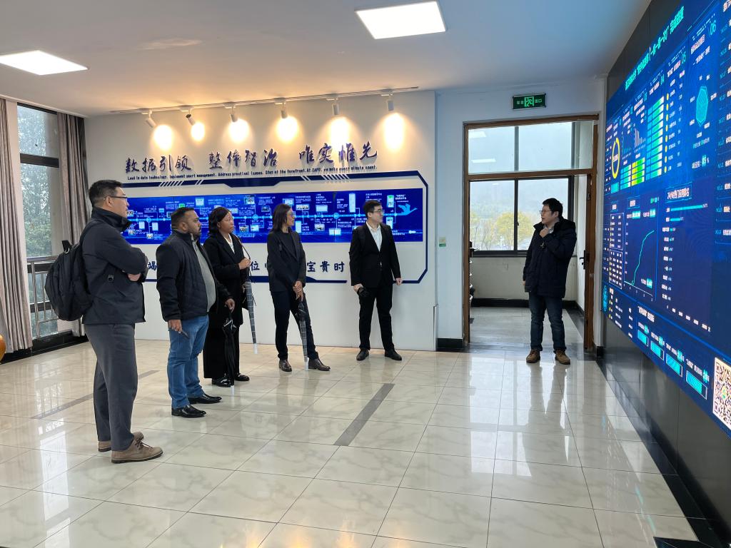 莫路锋带领参观了信息中心“一库一表一次”应用系统展示走廊和教1智慧教室,详细介绍了BEAT365信息化建设基本情况,展示了智慧教室建设成果,演示了天目云智慧教学平台。