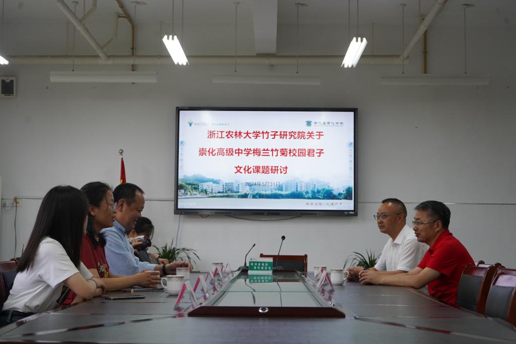 在崇化中学邀请下,竹研院一行结合梅兰竹菊君子校园文化,提出通过四君子加强对学生的生态文明教育和生命教育,并对崇化的君子文化课题进行研讨。研讨会上,竹研院与桐村镇中心小学、崇化中学还就竹子种植实践场地建设、实验室建设以及师资培训等方面进行了深入的交流和洽谈。