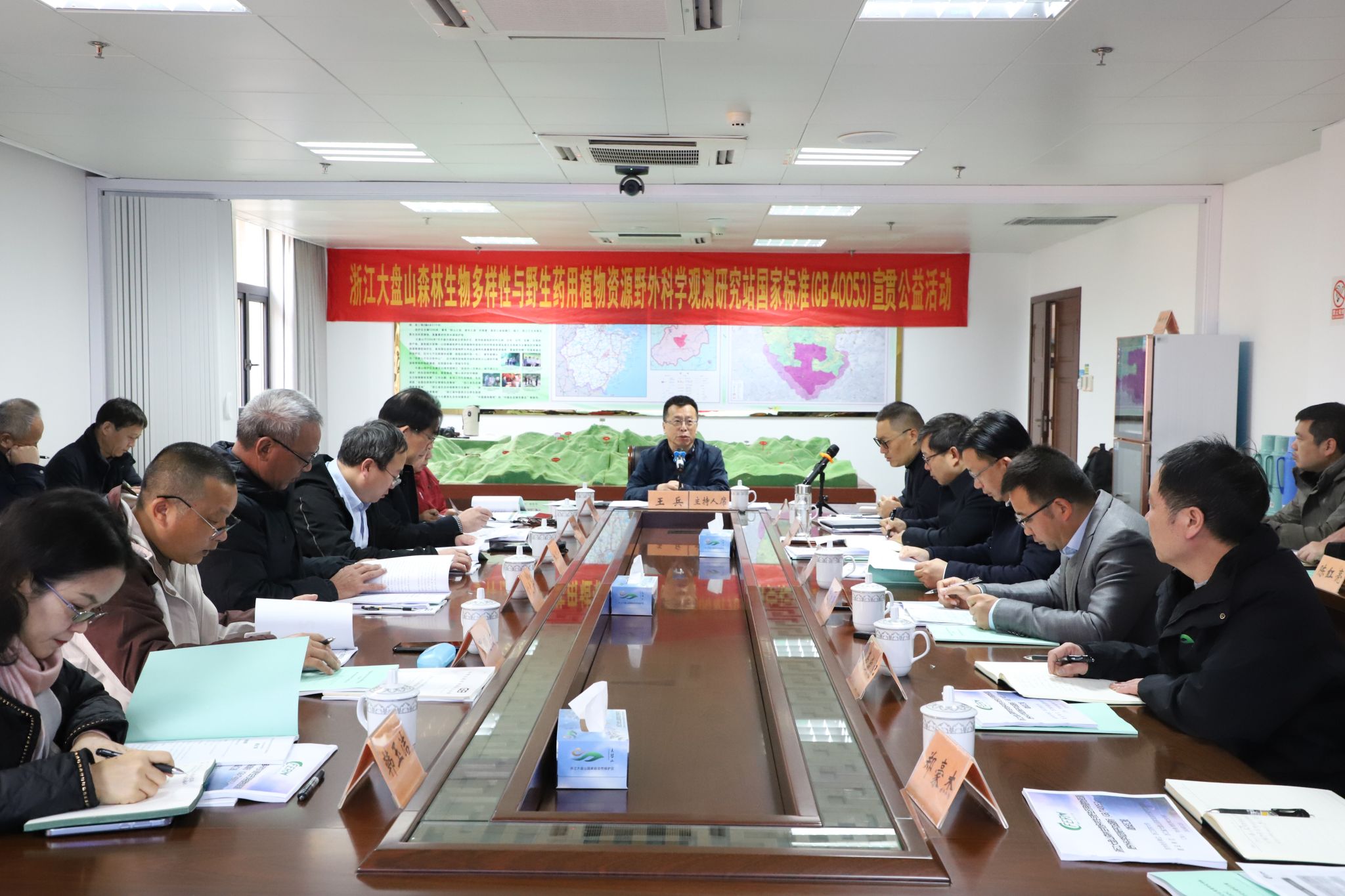 室内国标宣贯由王兵主持并致辞。王兵表示,大盘山作为我国唯一以野生药用生物种质资源为主要保护对象的国家级自然保护区,大盘山野外站是CFERN第一个以野生药用生物种质资源为主要观测研究对象的野外站,是传统经典生态学研究建站需求转化为服务产业、经济等社会价值体现建站需求的有效探索。