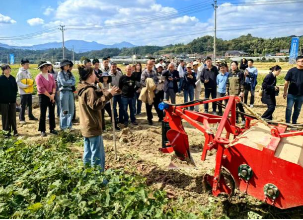 活动现场,团队自主研发与引进改良的小香薯多功能移栽机、小香薯杀秧收获一体机成为全场焦点。团队师生详细讲解了机具的结构、工作原理和操作要点,随后机具在示范田中平稳作业,完成起高垄、杀秧收获联合作业等工序,作业质量好,效率高。与会专家与种植户们现场查看机具的作业效果,与团队深入交流,并对机具在复杂地形下的适应性和应用前景给予高度肯定。团队负责人姚立健教授表示,将持续聚焦小香薯全程机械化的发展需求,不断创新机械化成产模式,助力天目小香薯产业持续向标准化、品牌化、高质量方向发展。