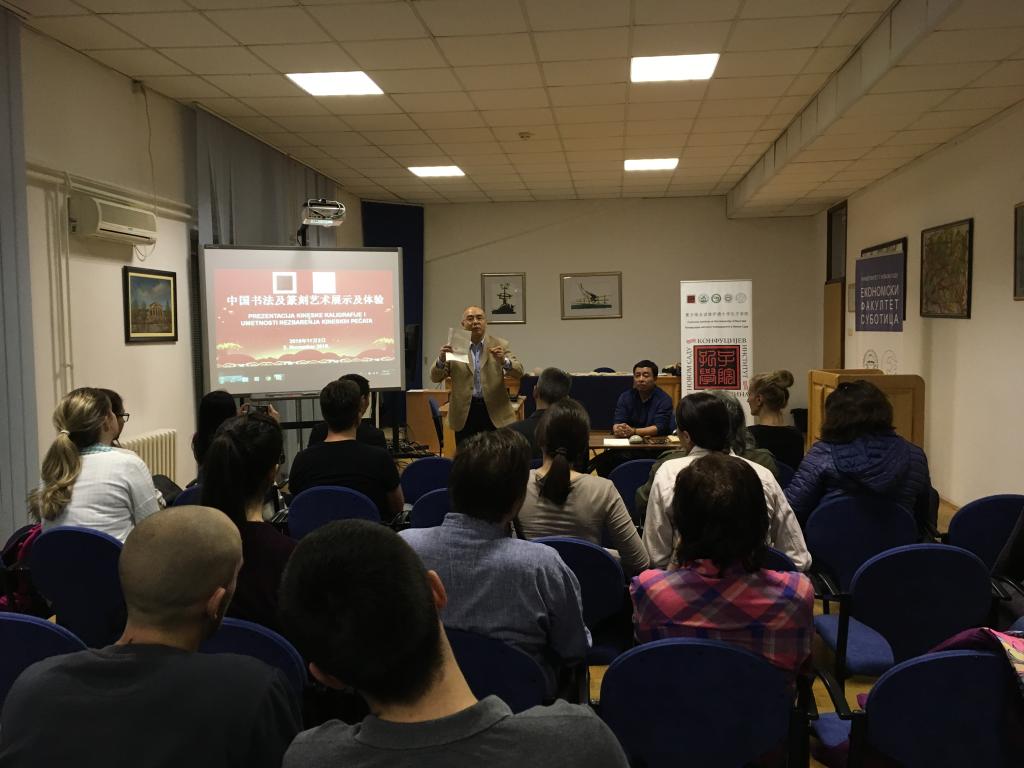 在诺大经济学院的体验活动中,经济学院副院长汤姆斯拉夫·苏达莱维奇(TomislavSudarevic)教授说:“我刚从中国参加学术会议回来,非常感谢两位艺术家不辞辛苦来到苏博蒂察,让我们有机会领略到中国的神奇悠久的书法篆刻艺术,真诚感谢合作单位诺大孔院对经济学院师生学习汉语、了解中国文化需求的热诚关注及和私帮助。”