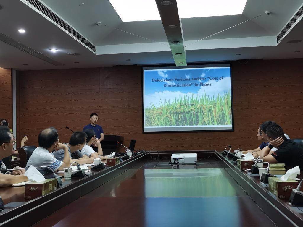 在交流会上,刘庆坡教授做了题为《Deleterious Variants and the “Cost of Domestication” in Plants》的学术报告。中国水稻研究所的师生就报告内容踊跃提问,双方就“如何定义有害变异”等科学问题进行了深入的交流和探讨。