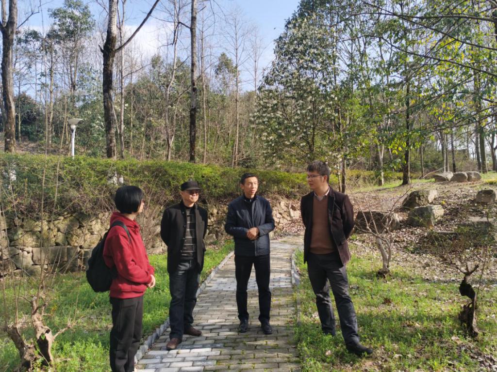 赵宏波与胡银春一行,勘查了盆景园改造现场,商讨了学六后地块综合教学实践基地的月季园建设、道路铺设与景观廊架建设事宜。