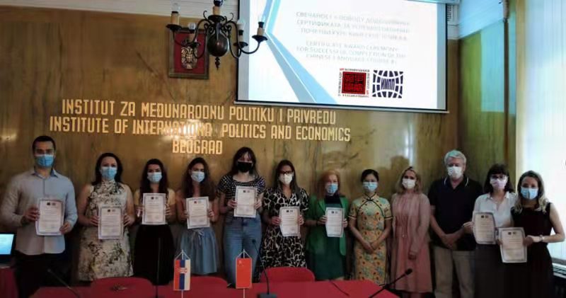 布拉尼斯拉夫·乔尔杰维奇(Branislav Dordevic)致辞表示,感谢诺大孔院的支持,顺应本院研究员及贝尔格莱德市市民学习汉语的需求,与我院合作开设了这期汉语课程班,为学员们提供了一个进一步了解中国、进行语言交流实践的窗口,学员们对本学期的汉语课都非常满意,下学期将会继续学习,并希望能再开一个初级班,让更多的人获得学习汉语的机会。陈晦在向各位学员坚持3个多月的学习、顺利通过考试表示祝贺后说,中国和塞尔维亚虽然相距遥远,但两国交往密切、人缘相亲。