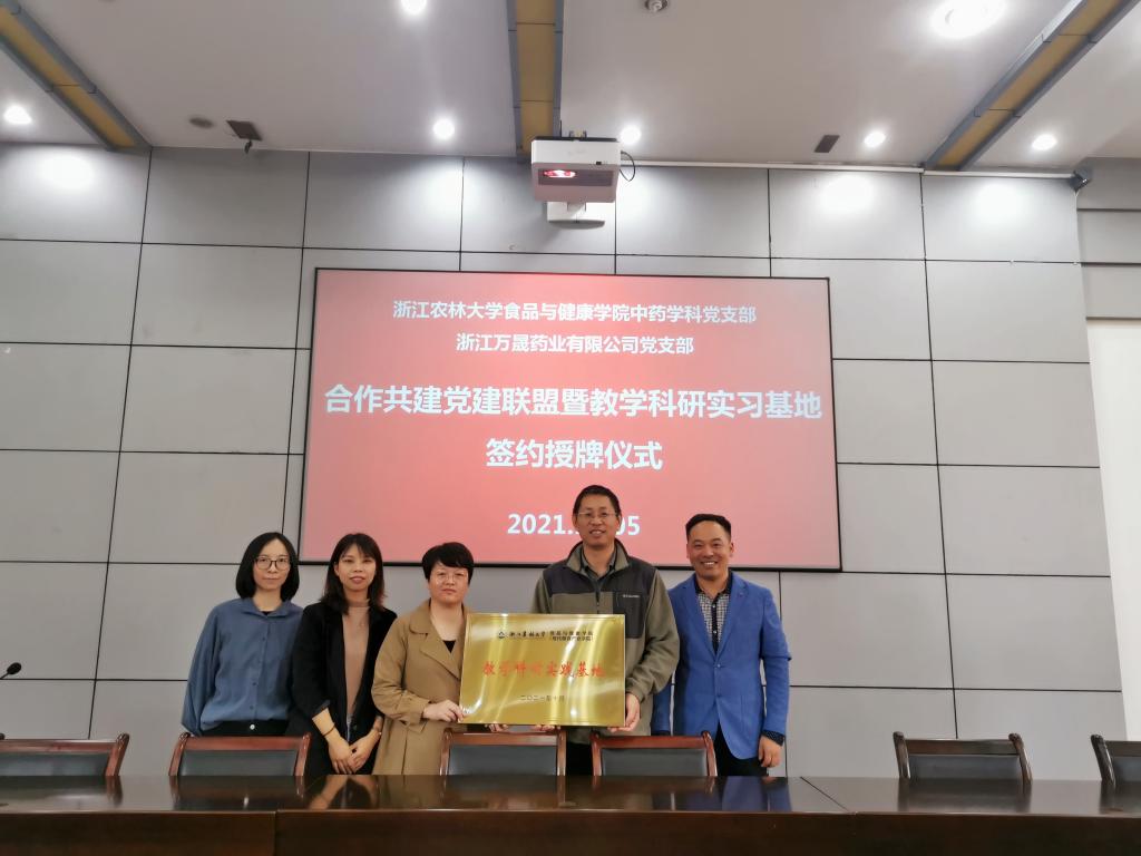 11月5日,食健学院中药学科教工党支部与浙江万晟药业有限公司党支部举行合作共建党建联盟暨教学科研实习基地签约授牌仪式。学院党委书记汪和生,浙江万晟药业有限公司质量总监兼总经理助理阎晓文、人力资源部总监戴爽等出席签约仪式。