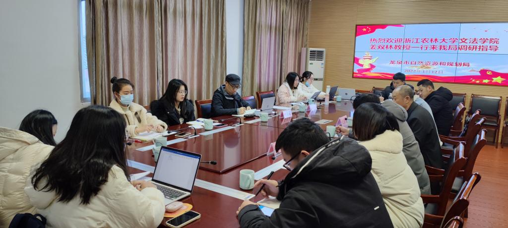 1月10日下午,课题调研组赴龙泉市发展和改革局参加座谈会,发改局、林业局、自然资源和规划局、财政局、农业农村局、水利局、科技局相关领导共同与会。姜双林教授对本次调研所依托的丽水市发改局、财政局立项课题《建立健全生态产品政府采购机制研究》以及调研主要方向进行了简要介绍。龙泉市(发改局)项目建设服务中心副主任廖卫阳和发改局各分管负责人分别介绍了目前在生态产品政府采购机制工作中的经验和困惑,并与调研组师生就重点问题展开讨论。