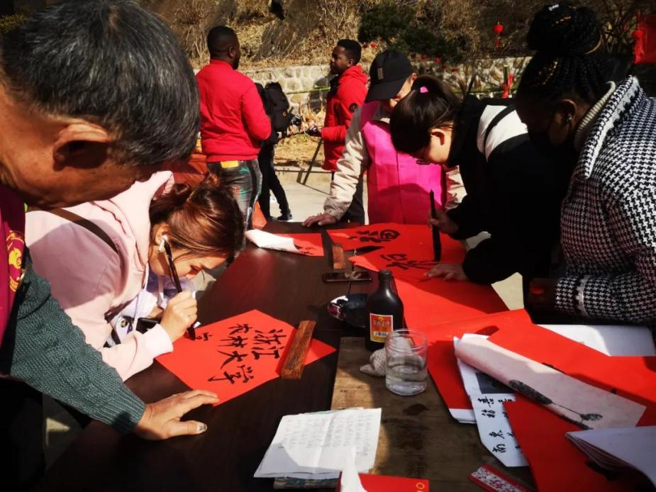 在文武上田村落景区,中国书法专家与留学生书写一副副对联,共同祝福全世界;包包子体验活动中,软软的面团在村民阿姨的手里旋转出了一个个“小酒窝”,引得留学生赞叹不已,忍不住纷纷上手尝试。
