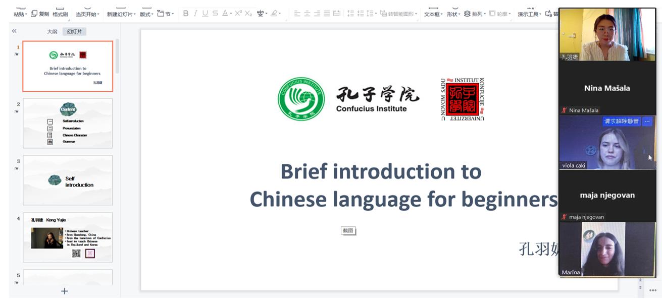 根据报名学生的不同汉语水平,授课教师将课程设置为零起点班和HSK2级班进行教学。本期课程将持续15周,由教育部语合中心派出的诺大孔院汉语教师进行授课。当前塞尔维亚的疫情形式仍然不容乐观,根据当地防疫政策,中文课程采用线上形式安排在周末时间进行。