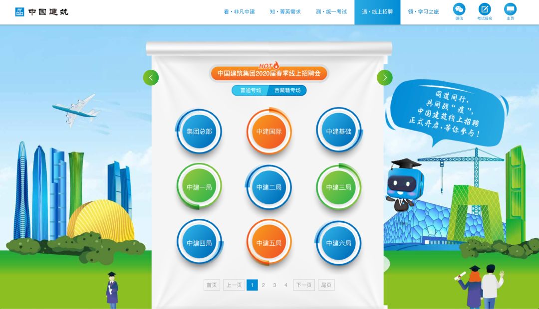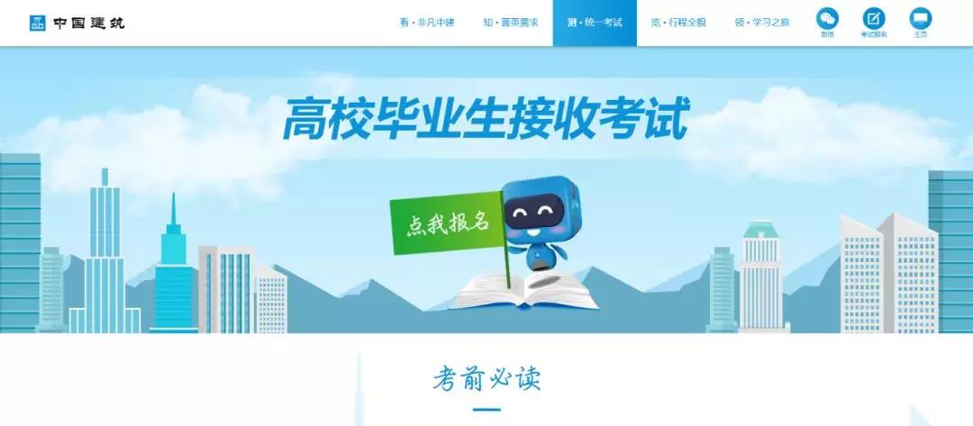 1.登陆中国建筑校园招聘网站,点击测·统一考试,在线参与中国建筑高校毕业生接收考试,有关信息请点击下图。